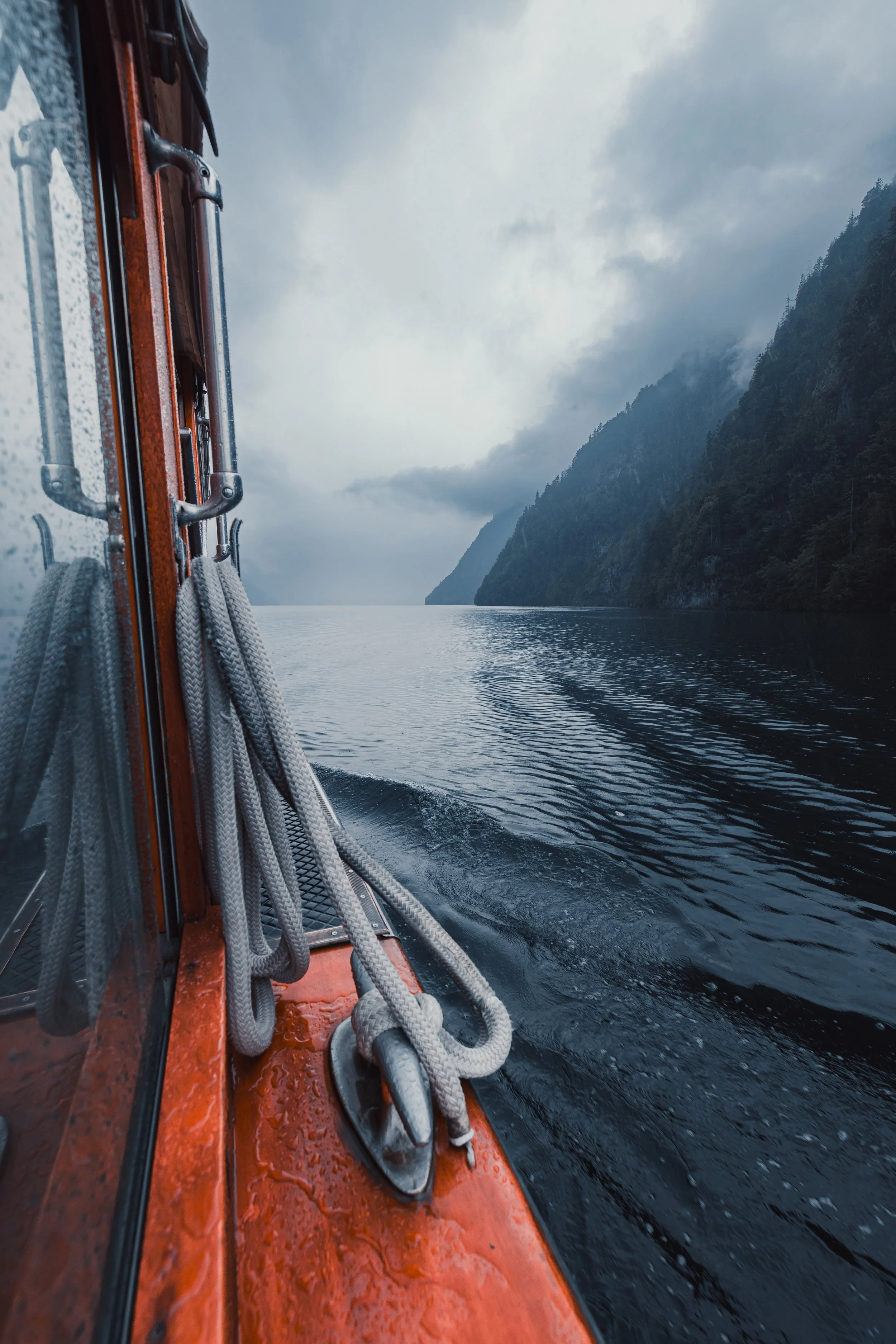A boat is docked at a foggy harbor, with wooden pilings on either side and a misty landscape in the background.