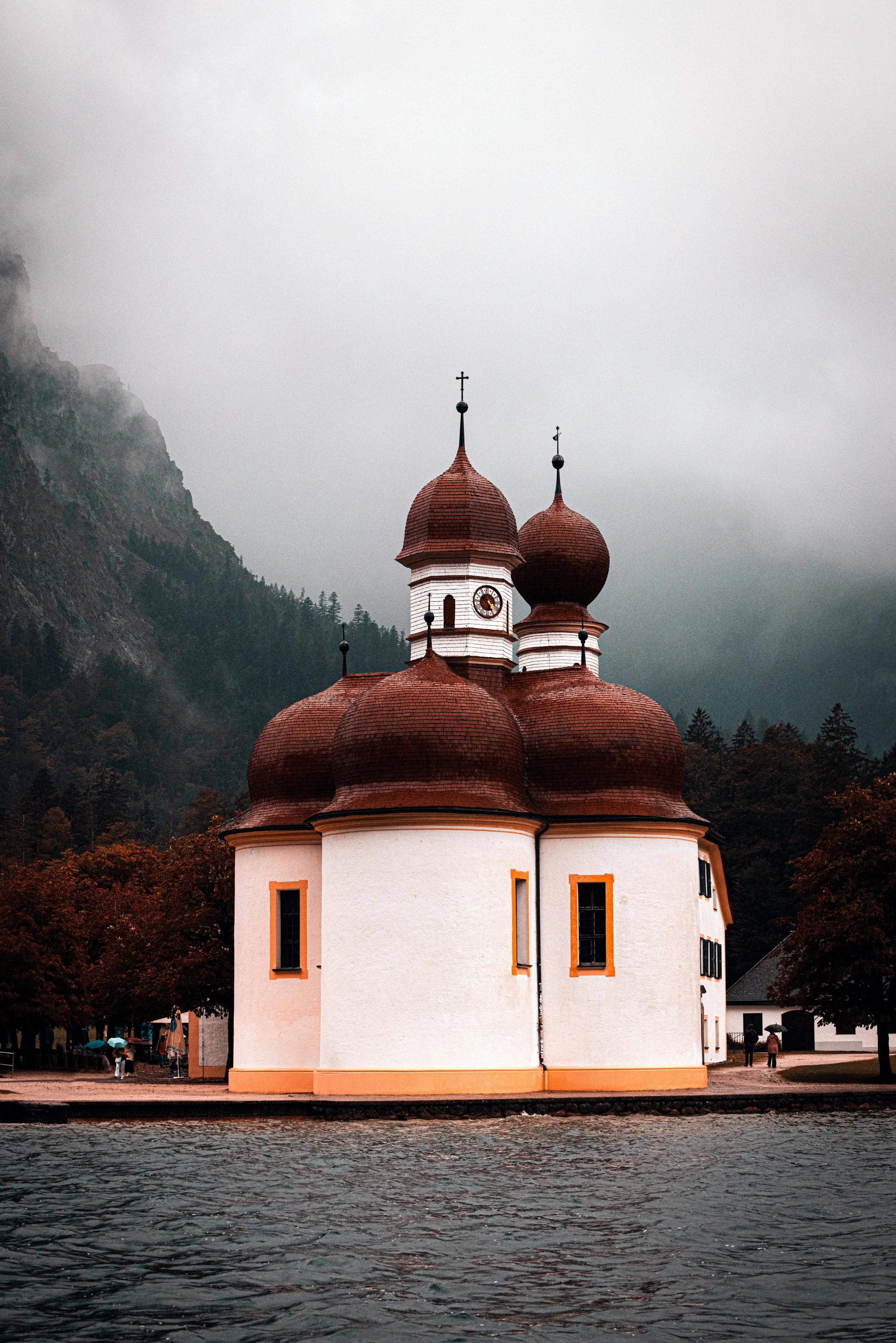 A fairy tale castle on a hill surrounded by dense green forest with mountains and fog in the background.