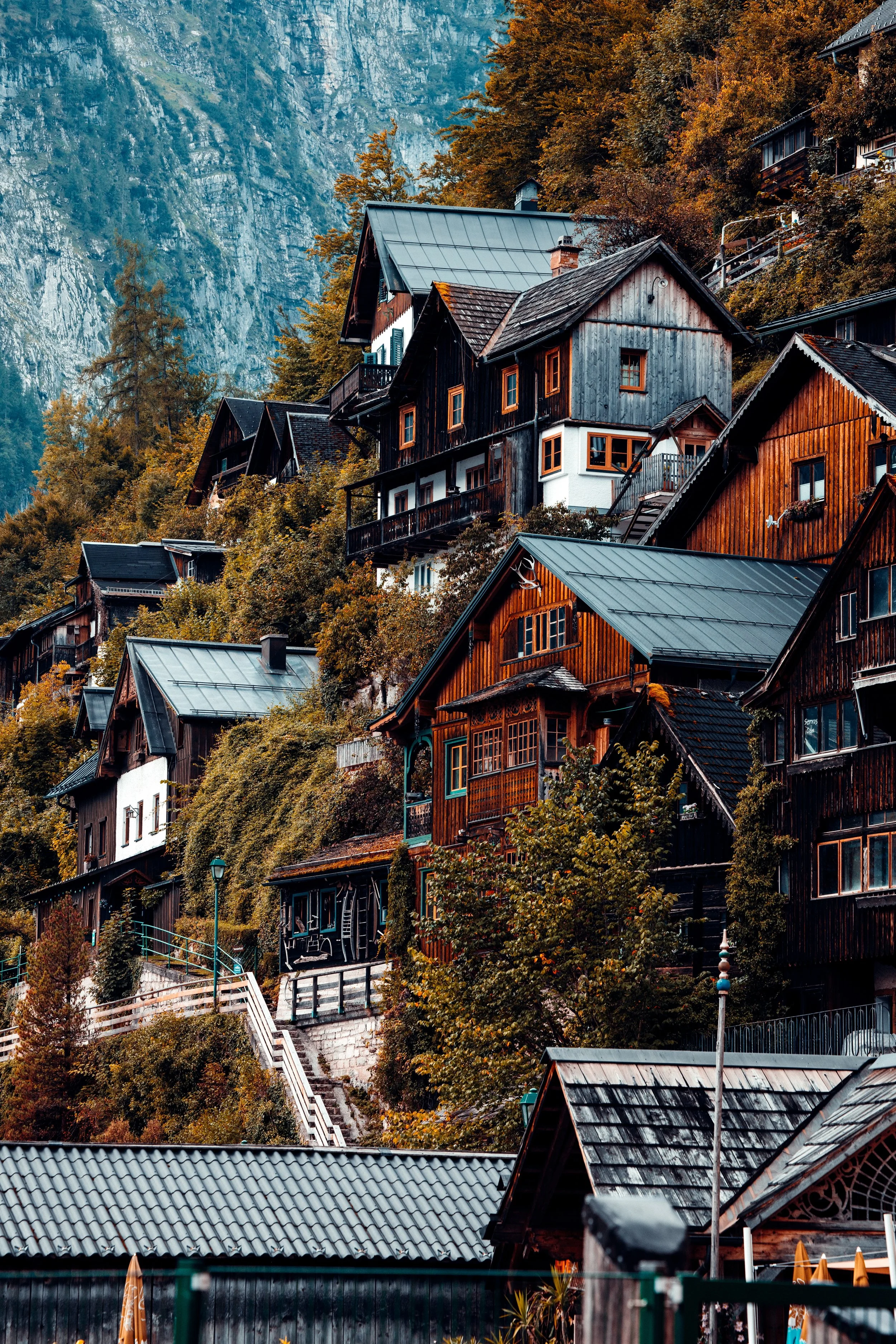 Charming mountain town with hotels and houses nestled at the base of a lush, foggy forested cliff with a waterfall.