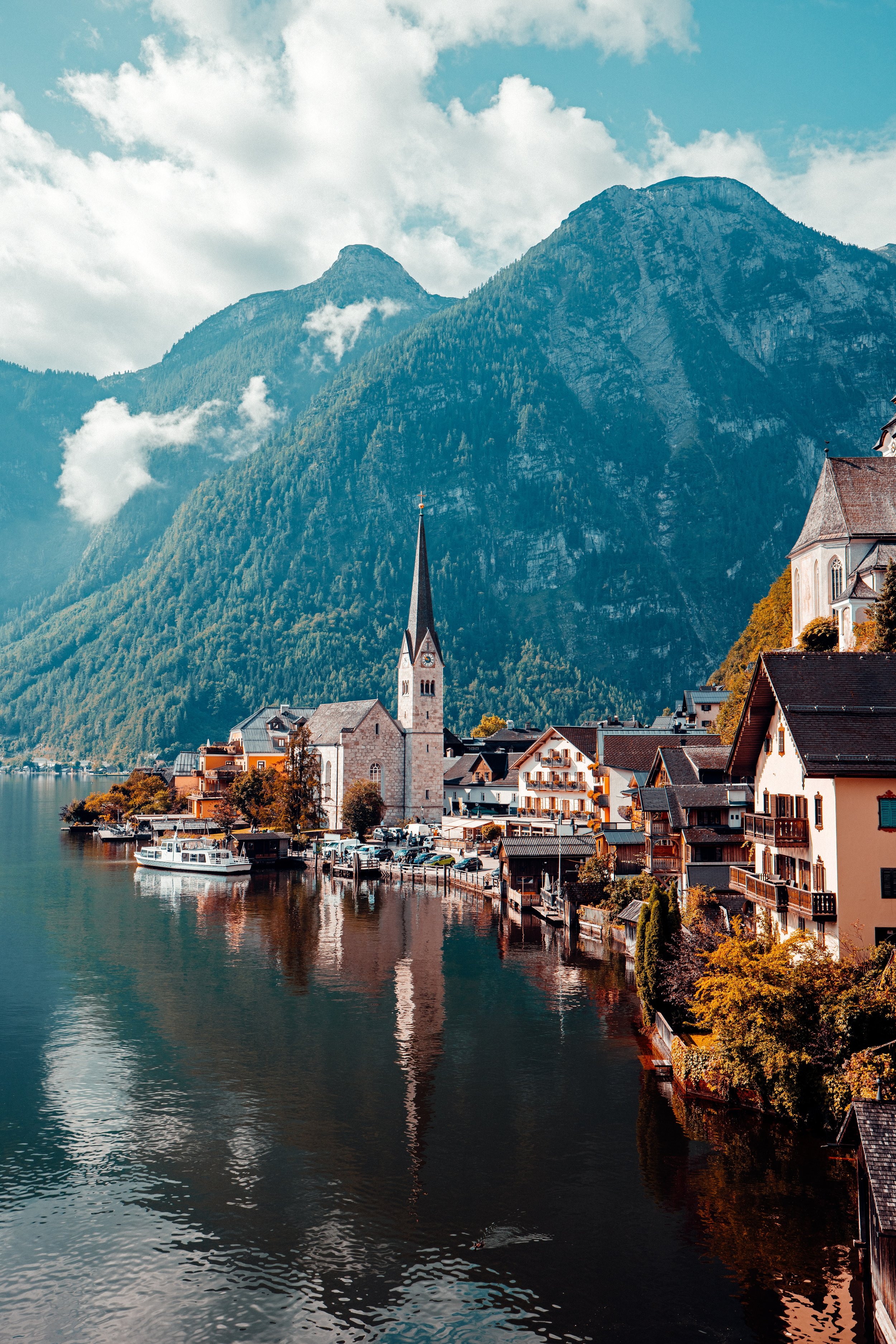 A scenic view of a mountain lake surrounded by autumn-colored trees, with a small village in the foreground and snow-capped peaks in the background.